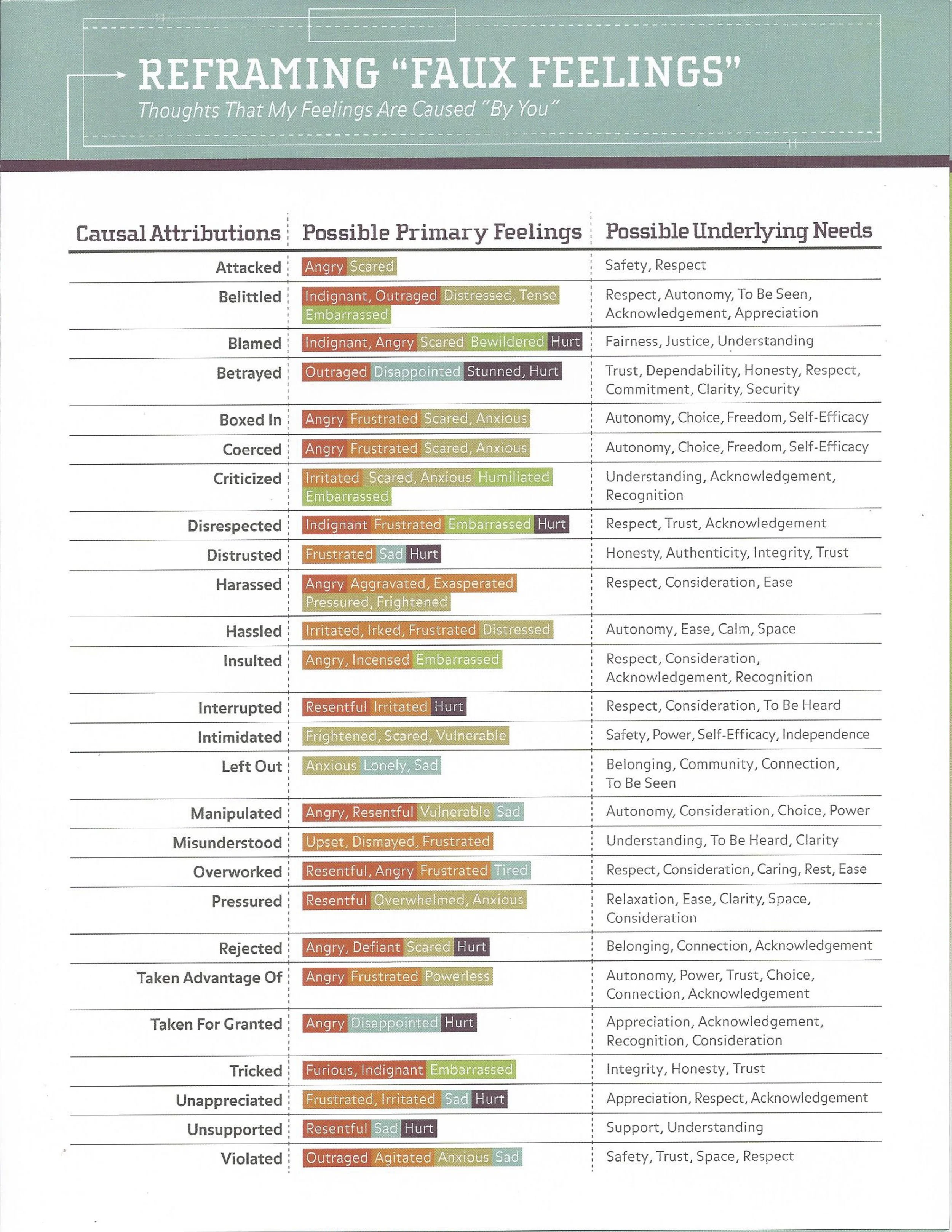 Here is a list of “Faux Feelings” and possible primary feelings and underlying needs to help you translate them.